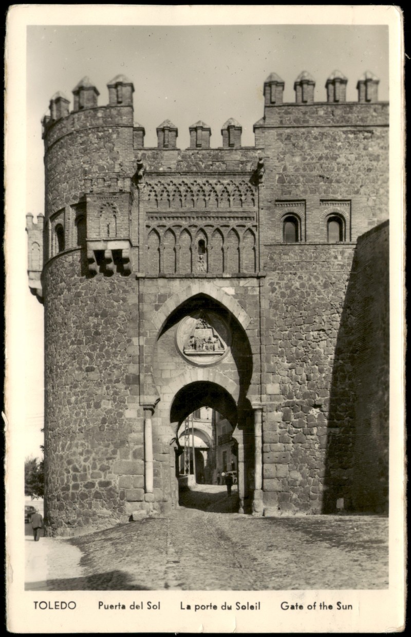 - Fotografische Ansicht des mittelalterlichen Stadttors 'Puerta del Sol' (Sonnentor) in Toledo, Spanien. Das Bauwerk ist im Mudéjar-Stil errichtet. Die Bildunterschrift ist mehrsprachig in Spanisch, Französisch und Englisch ausgeführt. Rückseitig findet sich der Verlagsaufdruck 'Manipel' mit der Nummer 142205.