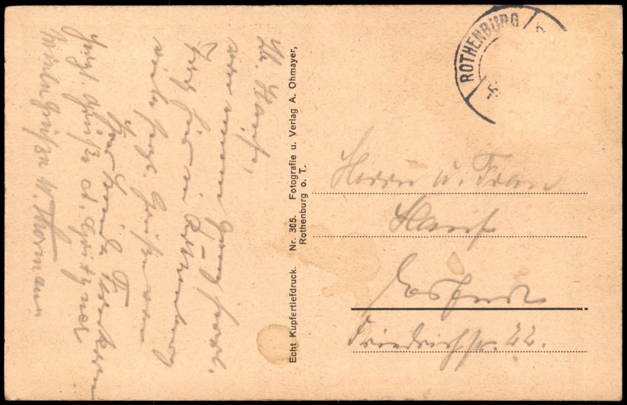 - Echt Kupfertiefdruck-Postkarte mit einer Ansicht des Weißen Turms in Rothenburg ob der Tauber. Das Motiv zeigt den markanten Turm mit Uhr und Durchgang sowie die angrenzenden historischen Fachwerkhäuser. Herausgegeben von Fotografie und Verlag A. Ohmayer, Rothenburg o. T., unter der Nummer 305.