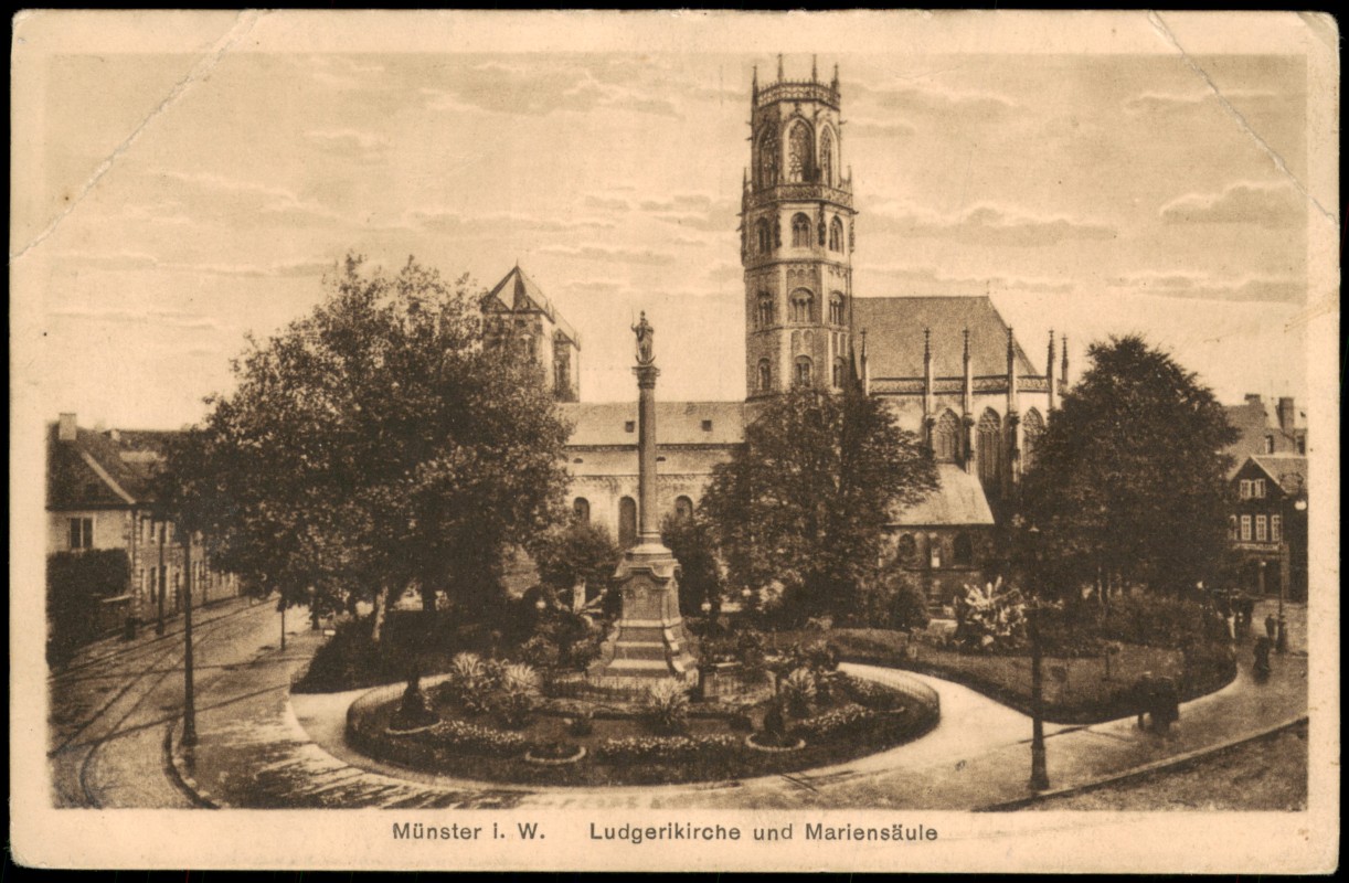 Postcart: Ludgerikirche und Mariensäule , Straßenpartie - Münster (Westphalia)