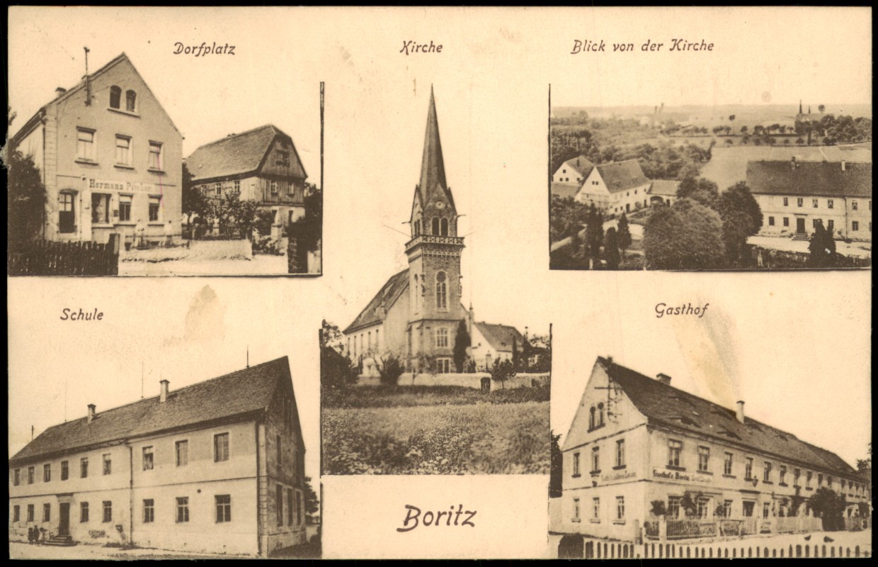 Postcart: Dorfplatz Schule Gasthof 5 Bild - Boritz-Hirschstein