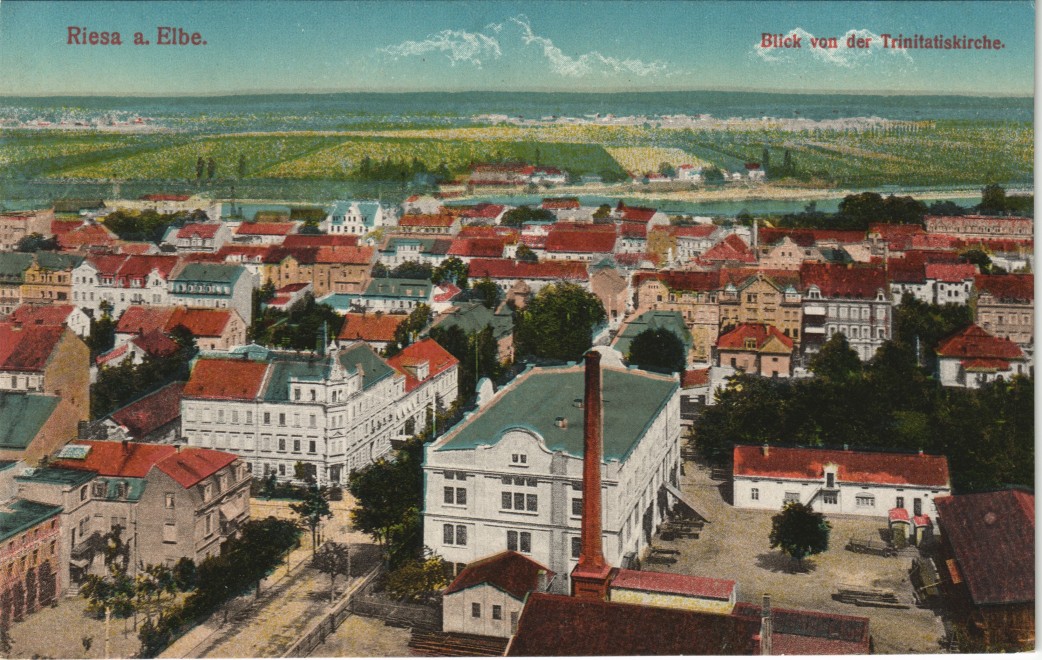 Postcart: Blick von der Trinitatiskirche auf Fabrik und Straße - Riesa