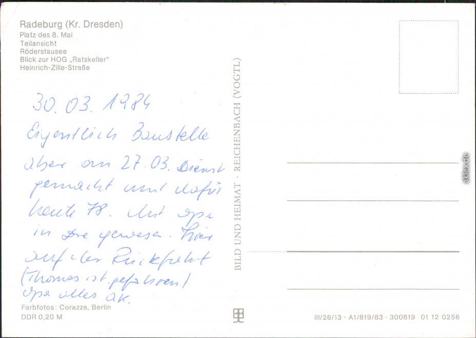 Postcart: Platz des 8. Mai, Teilansicht, Röderstausee, Blick zur HOG "Ratskeller", Heinrich-Zille-Straße - Radeburg