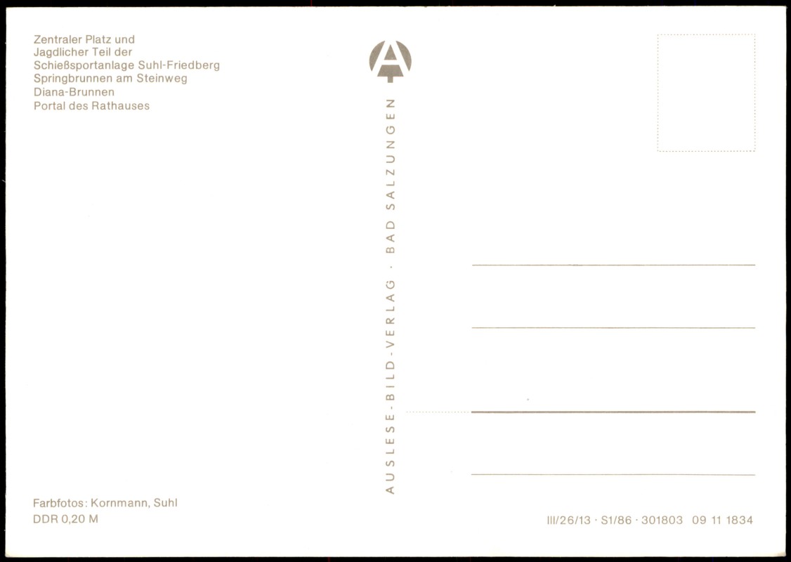 Postcart: Schießsportanlage, Springbrunnen am Steinweg, Diana-Brunnen, Portal des Rathauses - Suhl