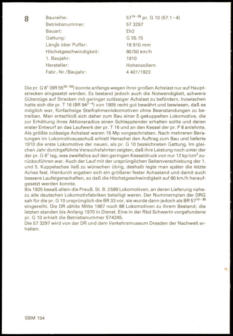 - Die Karte zeigt die Lokomotive 57 3297 der Deutschen Reichsbahn (DR). Es handelt sich um eine G 10 (Baureihe 57.10-35), Bauart Eh2. Die Lokomotive hat eine Länge über Puffer von 18.910 mm und eine Höchstgeschwindigkeit von 60/50 km/h. Sie wurde 1910 von Hohenzollern hergestellt. Die Fabrik-Nr./Baujahr ist 4 401/1923. Die Lokomotive war für den Einsatz auf Strecken mit geringer zulässiger Achslast konzipiert. Sie war eine e-gekuppelte Lokomotive, die für den Entwurf ihres Aktionsradius eine Schlepptendern erhalten sollte. Die größte zulässige Achslast war 15 Mp vorgeschrieben. Nach mehreren Berichten und Versuchen wurde die Lokomotive 1910 als erste Lokomotive der neuen, als pr. G 10 bezeichneten Gattung, ausgeliefert. Die DR zählte Mitte 1967 noch 88 Lokomotiven zu ihrem Bestand; die letzten standen bis Anfang 1970 in Dienst. Eine in der Rbd Schwerin vorgefundene pr. G 10 erhielt die Betriebsnummer 574245. Die 57 3297 wird vom DR und dem Verkehrsmuseum Dresden der Nachwelt erhalten.